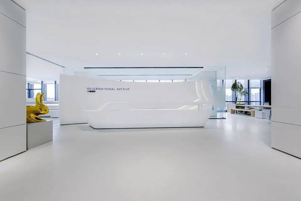 自由開放且有點潮流的辦公室,更受年輕人的喜歡,追求自我,追求舒適,以人為本,同時加入未來科技感與藝術感,打造一個更加好玩的辦公空間。同時加入現代人文,塑造辦公室獨特的氣質。前臺區域作為辦公室的初步印象,投射藝術科技感。曲面造型勾勒出線條,面與面之間的相互交匯融合,與一側的金屬藝術品進行趣味的對話。
